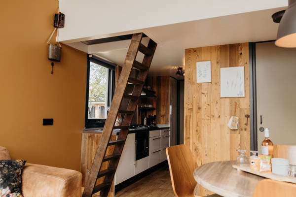 Binnen is links het keukenblok waar u gemakkelijk een heerlijk vakantiemaal voorbereid. Bij de keuken is de eethoek waar gezellig getafeld kan worden. Naast de keuken is een bank en staan er stoelen waar heerlijk gerelaxed kan worden.